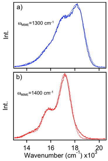 Differences in the observed MIME intervals between red and blue forms are proposed to originate chiefly from variations in displaced low frequency modes, most notably the out-of-plane C–H wag at ~966 cm−1. Based on our previous work, this mode showed the largest change between solution and solid polymer forms, which is reasonable since larger intensities (displacements) are expected for torsionally disordered chains. As demonstrated in Figure 4b,c, larger displacements in this mode shift intensity away from higher frequency modes resulting in a smaller observed MIME interval range of ~1220–1320 cm−1. Displaced low frequency modes effectively “fill in” regions between vibronic peaks and, while a similar effect can be obtained by increasing the linewidth broadening parameter, Γ, the fit spectrum no longer matches with the linewidth of the 0-0 electronic origin transition. On the other hand, the larger observed MIME interval in the red emitting form implies a smaller C–H mode displacement where intensity is shifted toward the higher frequency modes (i.e., the ~1580 cm−1 mode), as seen in Figure 4b,c. This simple analysis of single chain PL lineshapes reveals useful insights into the conformational characteristics of each emitting form far beyond simply categorizing emission energies. Namely, the lower progression interval observed in the blue form indicates larger displacements of the out-of-plane C–H wag and, hence, larger torsional distortions of the backbone conformation. This feature is also consistent with the apparent shorter conjugation lengths of the chromophore segments (i.e., torsional induced exciton localization). Dispersing single molecules in a heavy matrix or applying SVA treatments, results in planarization of chain segments due to swelling of the matrix thus allowing chains to self-fold into more ordered, rod-like or collapsed structures [21,22,23,24]. The increase of chain planarity lowers the C–H wag displacement resulting in a larger MIME interval as seen in PL line shapes of the red MEH-PPV form. Overall, interpreting spectral changes in terms of the MIME model yields useful insights into the conformational characteristics of the polymer backbone segments as well as the structural factors that change upon conversion between these different emitting forms.