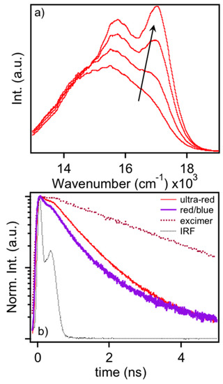 (a) PL spectra of an MEH-PPV thin film upon application of solvent vapor annealing; and (b) PL decays of single molecule MEH-PPV emitting species. Corresponding PL decay of an annealed thin film displaying excimer type emission is also included.