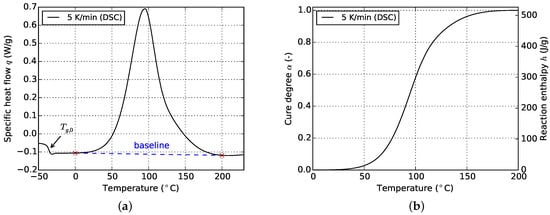 Evaluation of DSC data (exemplary for non-isothermal curing). (a) Specific heat flow; (b) Cure degree.