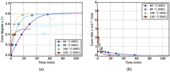 The aforementioned difficulty related to isothermal measurements is visible in Figure 2a. Usually, higher temperatures lead to higher cure degrees since can reach greater values before vitrification occurs and the reaction halts. However, the isothermal DSC measurements in Figure 2a do not show such a behavior. Instead a decrease in final cure degree is noticeable. This is in contradiction to the findings of Section 5.1 which prove higher achievable cure degrees for increasing isothermal temperatures as well as incomplete cure in case of lower curing temperatures even for long periods of time. This error is therefore attributed to the amount of cure which is lost during specimen preparation and measurement initialization. Additionally, as can be seen in Figure 2b, the cure rate strongly depends on temperature and, more importantly, reaches maximal values at the very beginning of the measurement. Therefore, even small periods of time without data acquisition in this region can introduce significant deviations in cure degree. This circumstance has to be addressed during model parametrization as otherwise poor prediction accuracy is to be expected.