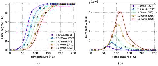 The cure rate of non-isothermal experiments shows a dependency on temperature, as is visible in Figure 3b. However, in case of small heat ramps, most of the reaction takes place at rather low temperatures since the dwell time in this region is long enough to compensate for low temperatures. On the contrary, high heat ramps shift the majority of the reaction towards higher temperatures since these are reached in shorter periods of time. Corresponding curves of the cure degree confirm this behavior as can be seen in Figure 3a.
