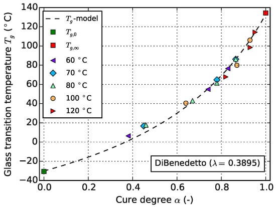 Figure 4 shows the dependency of on cure degree as well as the fitted DiBenedetto -model which is in good agreement with experiments. The corresponding value for the model parameter of Equation (4) is λ = 0.3895. The experimental values are determined by creating the midpoint between the glassy and the liquid/rubbery lines and identifying the corresponding temperature. Because of the different hold times and curing temperatures, the achieved cure degrees differ.