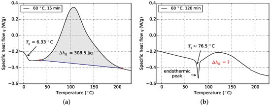Determination of from DSC heating scans is generally not recommended since represents the temperature of transition from liquid/rubber to glass instead of the reverse []. However, DSC devices are usually calibrated on heating and, more importantly, the state of the material is inevitably altered by first heating the specimen to a temperature markedly above and then cooling down for the purpose of actual measurement. The reason for incorrect values gathered from heating experiments arises from commencing the glass transition from a possibly non-equilibrium state. This depends largely on the thermal history which was previously applied to the specimen. Therefore, reasonable values can be obtained by starting the heating scan immediately after cooling and by ensuring that curing prior to cooling down is carried out at a temperature such that no vitrification occurs [,].