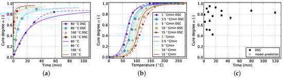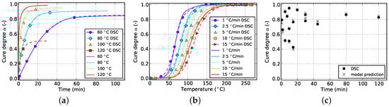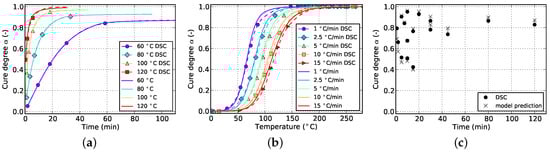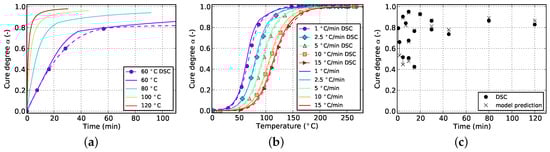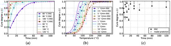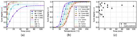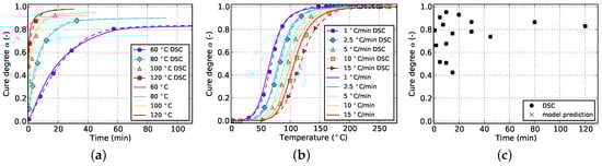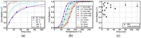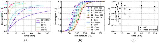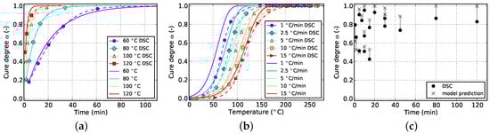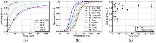 By comparing Figure 6 and Figure 12, it becomes evident that by adding cyclic data to the fitting target, the prediction accuracy of the Kamal-Malkin kinetic model for isothermal processing is improved considerably. This is especially evident when comparing the match with cyclic DSC measurements (cf. Figure 6c and Figure 12c). However, the slope at the end of isothermal curves still remains too steep. The reason for that is the type of data which is gathered from cyclic DSC runs. In contrast to pure isothermal measurements, cyclic DSC measurements as they are evaluated in the present paper, only provide data at distinct points. More specifically, there is no information about how a specific cure degree was reached or for how long a possible vitrification might have been present. As can be seen in Figure 7 and Figure 13, the Grindling model shows slightly better accuracy after adding cyclic data to the fitting target. Moreover, a sudden transition from chemically-controlled to diffusion-controlled reaction is indicated by a kink in the curve for isothermal cure at 60 C in Figure 13a.