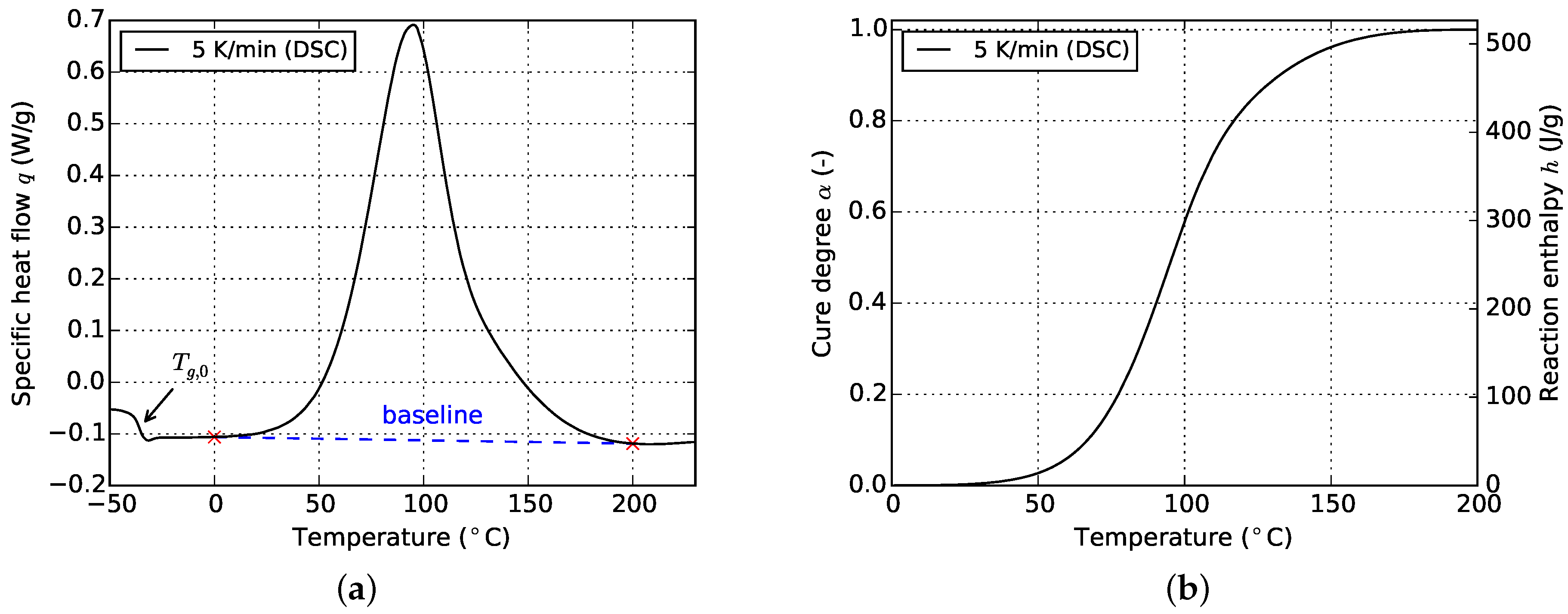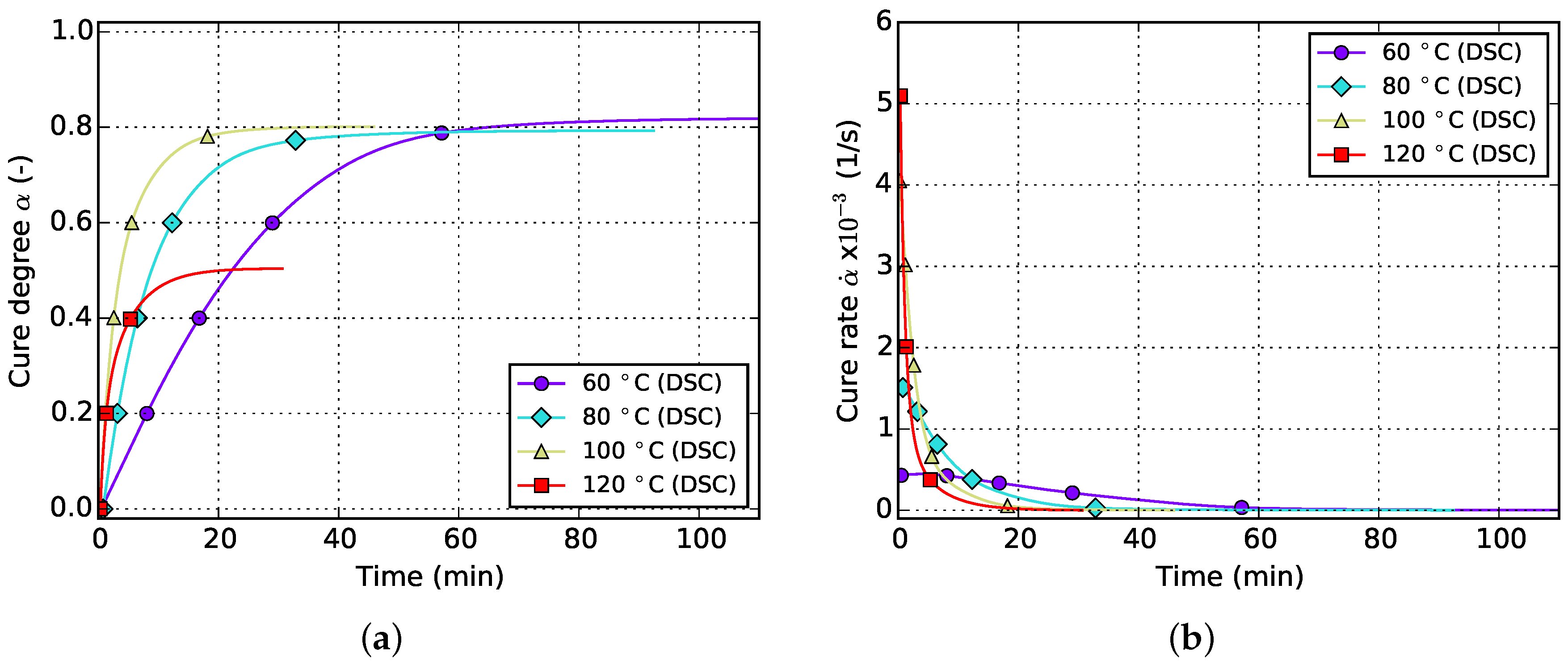 Figure 14a). The match with cyclic DSC data is therefore good but even though the reaction is slowed down, it will reach full cure for longer periods of time. Moreover, vitrification occurs for distinct isothermal temperatures at different cure levels which the Kamal-Malkin kinetic model is not able to account for. This results in a too early slow down of the reaction in case of the lowest as well as a too late slow down for the highest isothermal temperature. Hence, the glass transition temperature which is directly related to the cure degree is underestimated, or in the latter case, overrated. This can have a significant impact when using such predictions for process simulation since many material properties depend on the glass transition temperature and whether the material is in glassy or rubbery state.