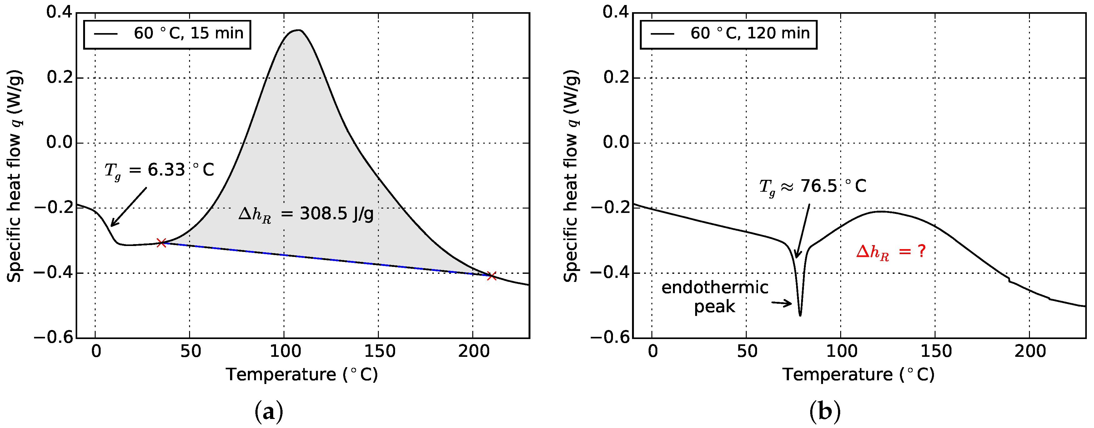Figure 12c). However, the slope at the end of isothermal curves still remains too steep. The reason for that is the type of data which is gathered from cyclic DSC runs. In contrast to pure isothermal measurements, cyclic DSC measurements as they are evaluated in the present paper, only provide data at distinct points. More specifically, there is no information about how a specific cure degree was reached or for how long a possible vitrification might have been present. As can be seen in