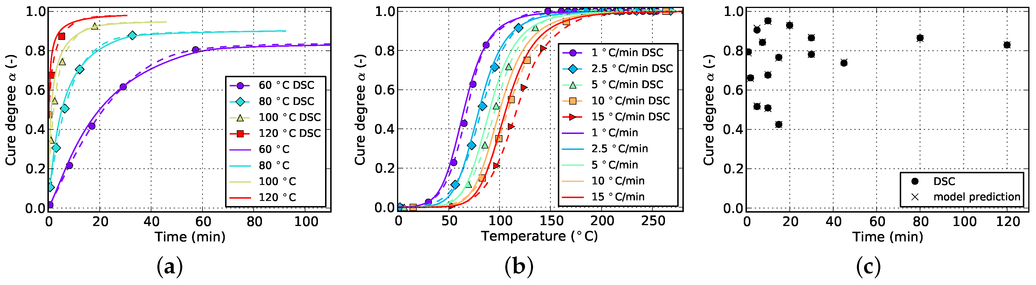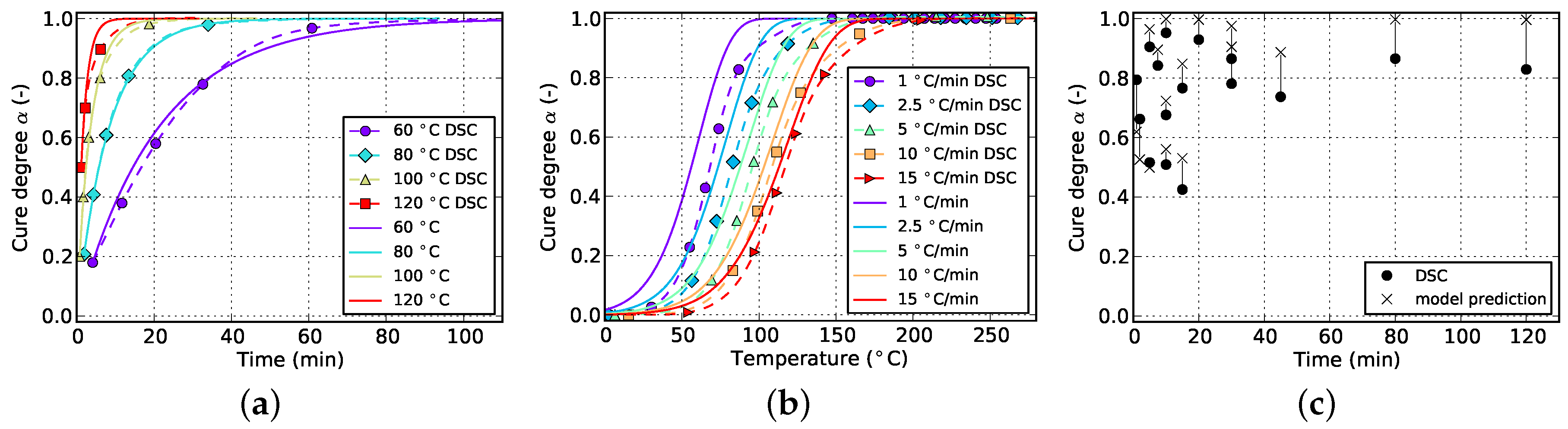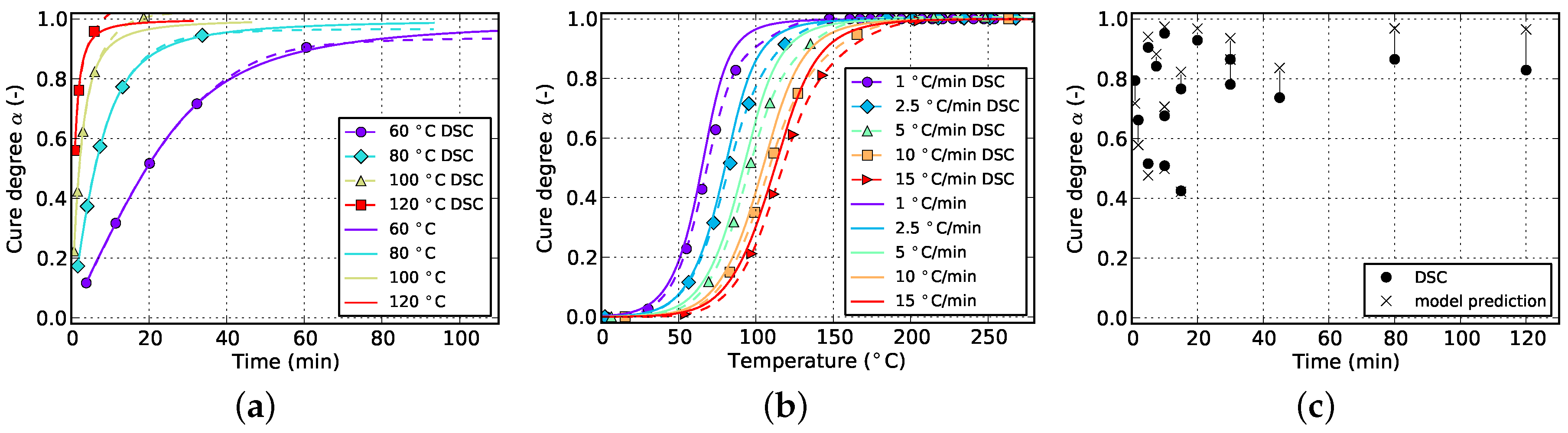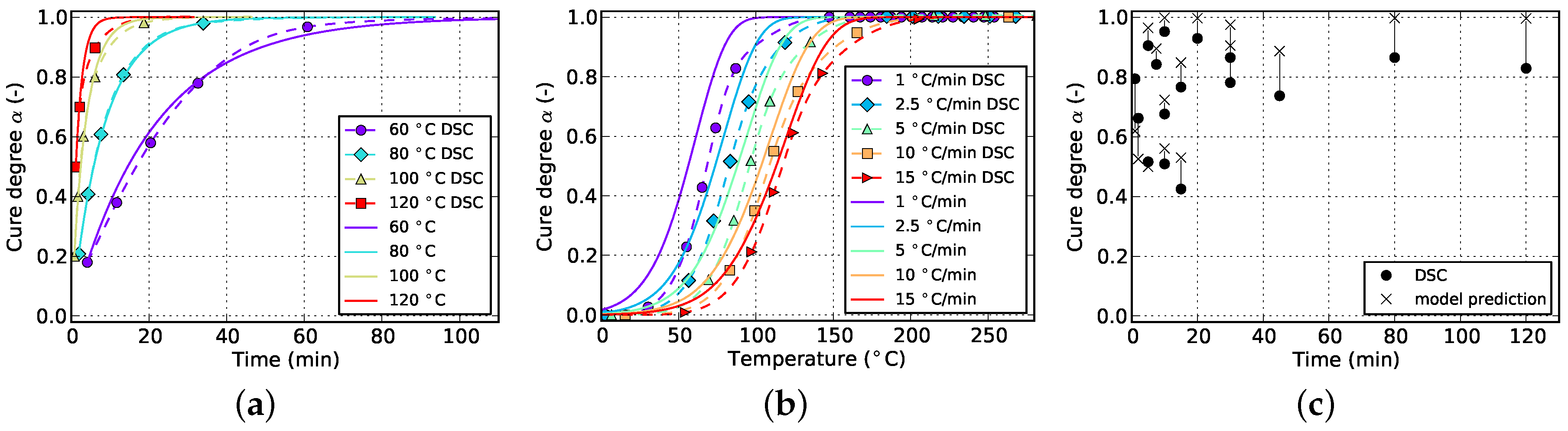 Figure 15c) and therefore the model is able to accurately predict the curing process. The agreement between model prediction and experiment declines as the heating rate is increased because the reaction is shifted towards higher temperatures which require the kinetic models to extrapolate the temperature dependency of the cure rate into this region. This introduces deviations which are most evident in case of the highest heating rate of 15