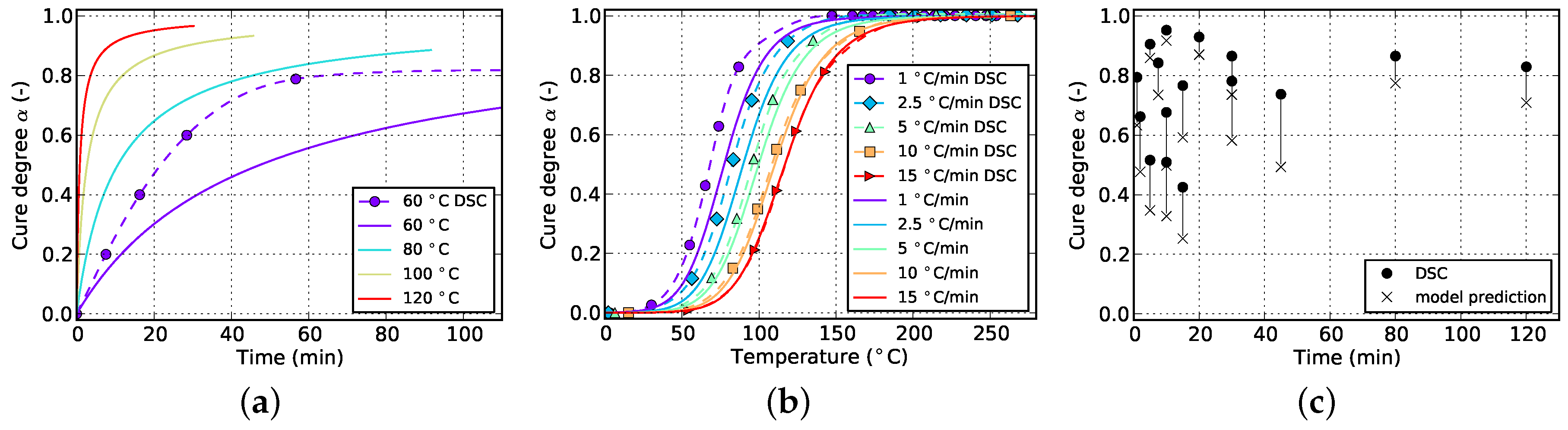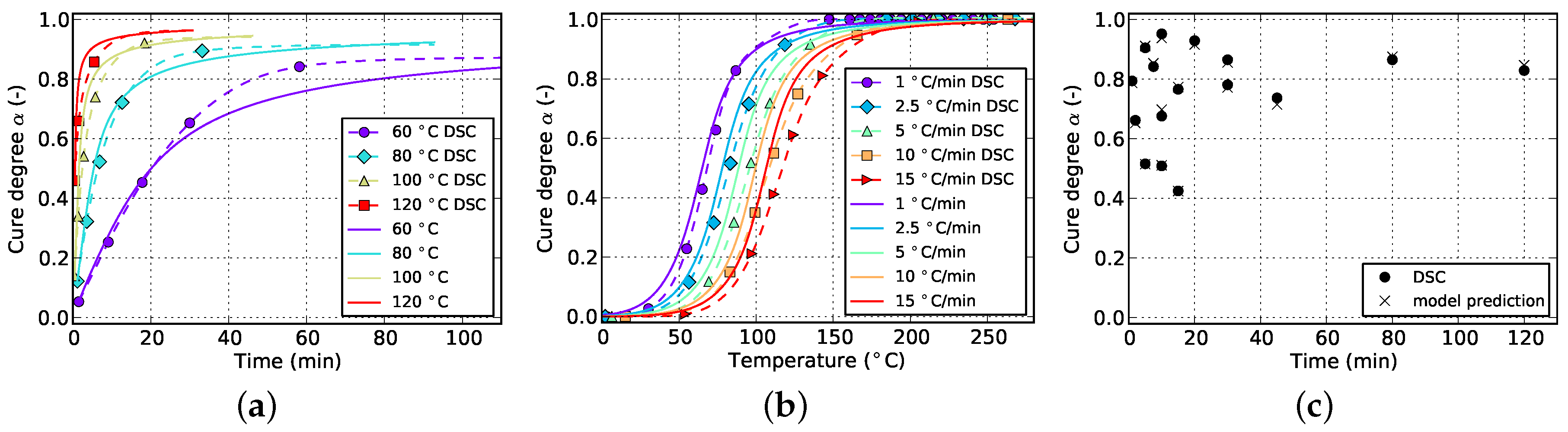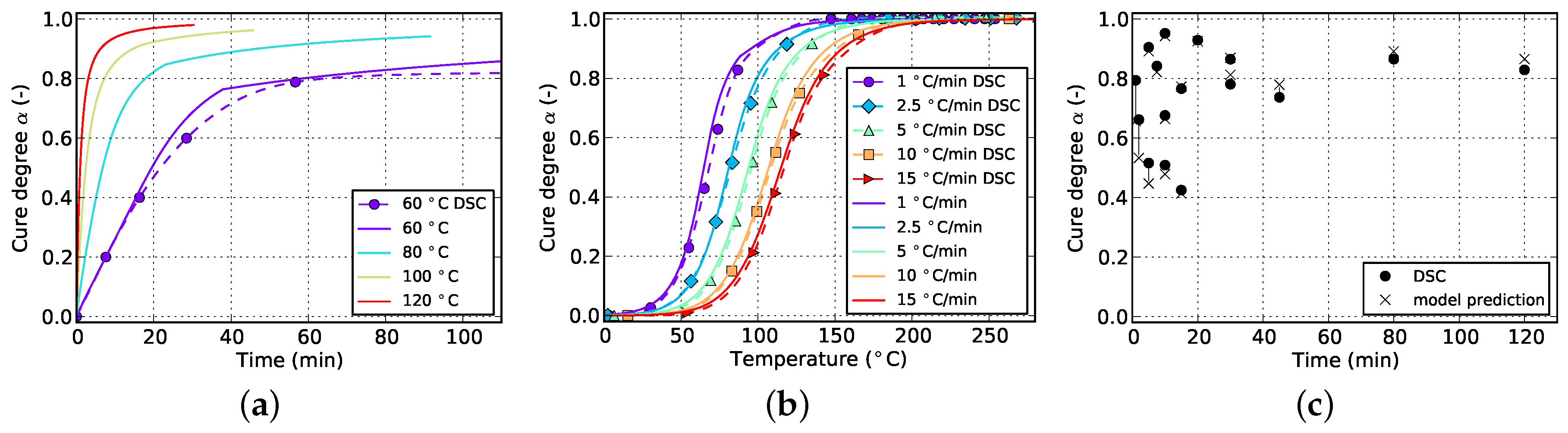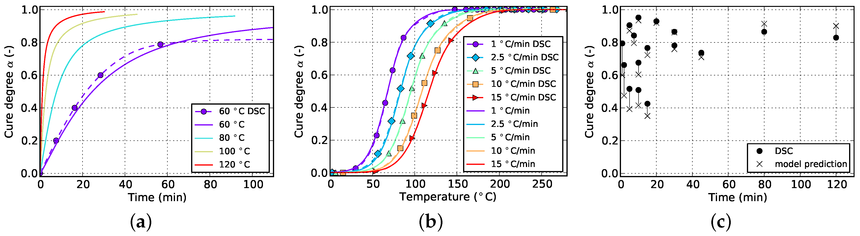 Figure 15c) and therefore the model is able to accurately predict the curing process. The agreement between model prediction and experiment declines as the heating rate is increased because the reaction is shifted towards higher temperatures which require the kinetic models to extrapolate the temperature dependency of the cure rate into this region. This introduces deviations which are most evident in case of the highest heating rate of 15