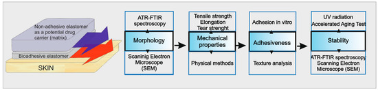 Figure 1 presents a set of the experiments performed during the study. The graph shows the physical structure of DLASil and parameters that were determined in order to assess applicability and stability of DLASil as dermal patches. It is proposed as a general strategy to characterise the adhesive silicone films as the development stage of dermal patches.