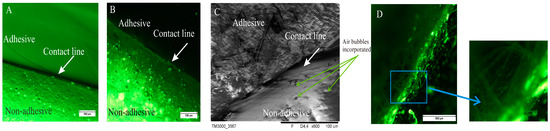 Deformation and flowing of the adhesive layer as a result of the electron bombardment in SEM: (A) 3.9 kV; (B) 3.5 kV.