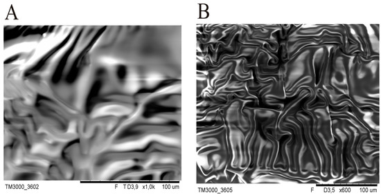 In the case of a dense polymer network, the lower ability to achieve maximum elongation can be seen, with a tendency to increase for DLASil, when the structure was relaxed by the addition of silicone oil. For properties such as tensile strength, elongation to break, and hardness of silicone elastomers, observed changes differ slightly. The possibility of adding silicone oil to the silicone matrix and assessing its optimum amount, which neither influences the crosslinking reaction nor the mechanical properties adversely, was evaluated. It should be emphasised that the addition of liquid components to silicone elastomers is not a standard practice. The study was planned to optimise the amount of silicone oil in the matrix, so as not to alter the mechanical properties (elongation, elasticity, and flexibility). It may happen that the relation between the compressive strength, the stiffness, and the tensile strength will change due to existing or emerging defects and cracks in the submicroscopic image of polymer structure [25]. Hence, it is important to study the morphology of polymer materials for medical use, since such observations may provide additional data to verify the mechanical properties of these materials.