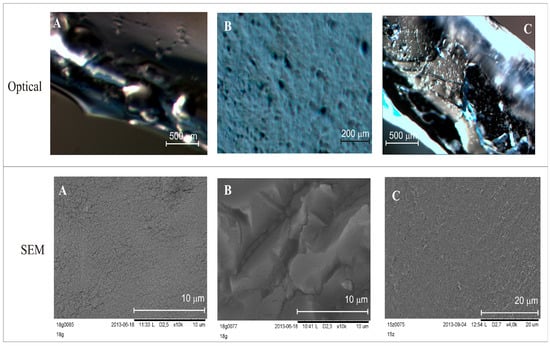 Images obtained by means of optical microscope and SEM: (A) adhesive silicone layer of DLASil; (B) nonadhesive silicone layer of DLASil; (C) Cica-Care patch.