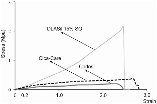 Comparison of the strain–stress curves obtained for Codosil™ and Cica-Care patches with Gumosil AD-1 film containing 15% w/w of silicon oil (SO).