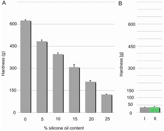 Correlation between hardness and silicone oil concentration in DLASil films (A). Hardness of Codosil™ (I) and Cica-Care (II) is presented additionally (B) (mean values ± standard deviation, n = 10).