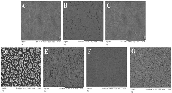 SEM images of DLASil layers’ surface: (A) reference—before testing; (B) stored for 28 days (40 °C, 75% RH); (C) refrigerated (4 °C, 28 days); (D) washed 10 times with a soap and water; (E) irradiated in the Suntest CPS+; (F) after mechanical test in a texture analyser; (G) Cica-Care without treatment.