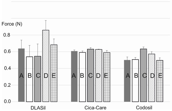 Adhesiveness of DLASil, Cica-Care, and Codosil exposed to storage conditions: (A) standard; (B) accelerated; (C) refrigeration; (D) UV exposure; (E) 10-fold wash (mean values ± standard deviation, n ≥ 10).