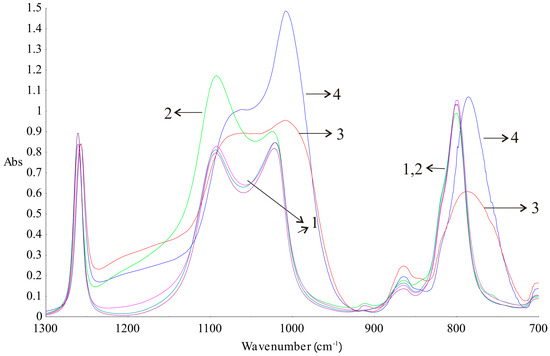 Attenuated total reflectance–Fourier-transformed infrared (ATR–FTIR) spectrum of silicone components (1—Gumosil Part B, DC A, DC B; 2—Gumosil Part A) and silicone elastomers (3—Gumosil after curing reaction; 4—DC after curing reaction).