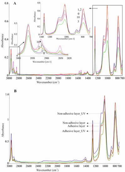 ATR–FTIR spectra recorded during stability testing of DLASil (A) adhesive layer during washing 0–10 times; (B) silicone elastomers after UV irradiation.