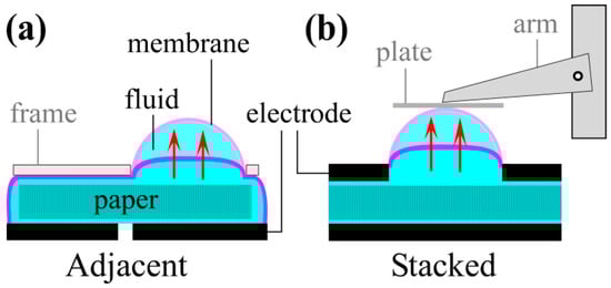Device designs with (a) adjacent and (b) stacked electrodes. A paper microchannel layer is positioned between the electrodes. Fluid pumped through the paper inflates an elastomeric membrane. Force and deflection are measured using a transducer, the arm of which rests on a pressure-distributing plate placed on the membrane.