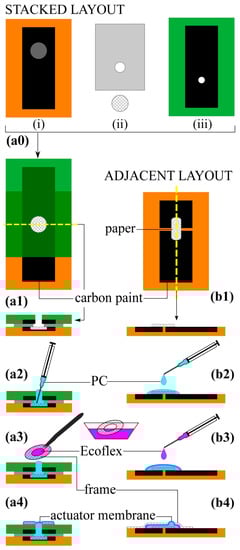 In the stacked layout, all the layers were made from PDMS except the actuating membrane, which was made from Ecoflex. The stiffer PDMS limits deflection to the membrane area. Actuators were fabricated using a layer-by-layer lamination process, starting with creating two electrode layers and an insulating separator (Figure 3(a0)). C-PDMS electrodes (0.5 mm × 2.5 cm × 6.4 cm) were formed on glass using stencils. In the lower electrode (Figure 3(a0i)), a thinner circular stencil (0.4 mm × 1.33 cm) was placed in the center to form a reservoir. PDMS was spin coated over the slides (t = 1 mm) to embed the electrodes and allowed to rest at room temperature for at least one hour to allow air bubbles formed at the electrode-PDMS interface to escape. Peeling off the substrate exposed the conductive surfaces. A hole (5 mm dia.) was punched through the top electrode (Figure 3(a0iii)). An insulating PDMS layer (t = 0.5 mm) was formed by spin coating and manual cutting (3.8 cm × 6.4 cm), and a hole (8 mm dia.) was also punched through its center (Figure 3(a0ii)). A piece of filter paper was cut (1.27 cm dia.) to fit inside the reservoir in the bottom electrode.