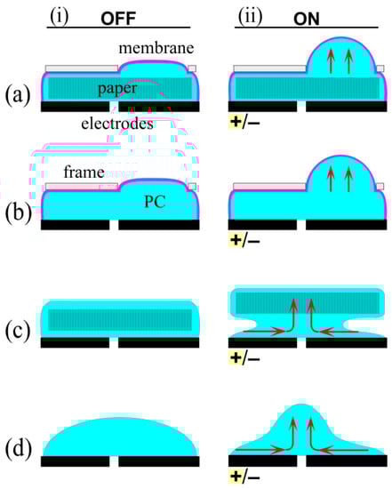 Schematic representation of fluid motion in the adjacent layout. (ai) The actuator comprised an actuating membrane encapsulating a pumping liquid and a paper microchannel layer above two planar electrodes; (aii) Application of voltage (5 kV) of either polarity caused membrane deflection; (bi) An actuator without the paper layer; (bii) Voltage of either polarity caused membrane deflection similar in magnitude to that in (a); (ci) An actuator without an encapsulating membrane, the liquid held by surface tension; (cii) Voltage of either polarity pulled the liquid between the electrodes, causing the paper to rise; (di) An actuator fabricated without paper and without an encapsulating membrane; (dii) Voltage of either polarity drew liquid toward the gap between the electrodes, forming a bulge with visible fluid circulation.