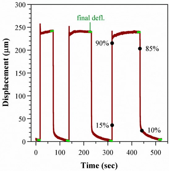 The time trace for one cycle in one device is shown in Figure 6. The membrane inflated quickly by hundreds of μm, with similar deflections for each cycle. Some of the deflection curves showed spikes upon membrane inflation. These occurred randomly and were not specific to a sample or voltage range.