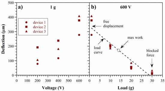 The average deflection during each step was obtained from the last 10 s (last 1000 points, sampling rate 0.01 s) before the voltage was switched. The average of the three step averages is plotted as a function of voltage for three devices in Figure 7a. Deflection increased with voltage, as expected for EO. Run to run variation for a given device and voltage was ±10 μm. Between devices, the variation in deflection was larger, up to 70 μm, due to the manual fabrication and the manual positioning of the force distribution plate and transducer. The variation did not depend on voltage.