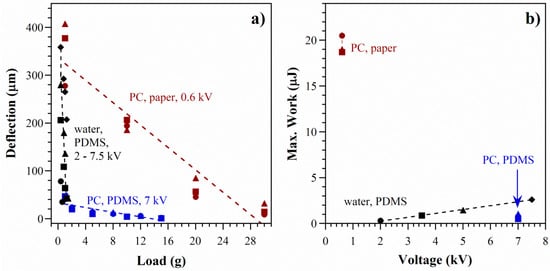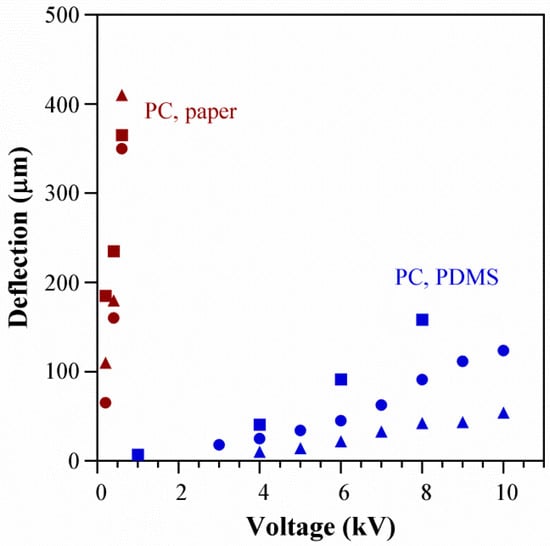 The finding that deflection scales with voltage implies that the extent of actuation can be altered using the input electrical signal, which is significant for the development of versatile control systems for smart materials and soft robotics. In principle, stroke could be increased by raising the voltage up to the dielectric breakdown field of the pumping liquid (2.2 MV/cm for PC, equivalent to 0.66 MV in these devices [79]). However, voltages above 10 kV led to immediate device failure: we observed sparking and the electrodes short-circuited, leading to noticeable Joule heating (the device became warm to the touch) as well as burn marks on the PDMS between the electrodes. In these devices, actuation was limited by the stiffness of the structure and volume of the fluid, as discussed below. For this reason and because of our interest in low-voltage operation, voltages above 600 V were not used during testing. Other methods to increase stroke might include switching to a pumping liquid with a higher dielectric limit, using microchannels with higher surface charge (zeta potential), or decreasing the membrane stiffness. Figure 8 compares the membrane deflections of the paper-based actuators to previous prototypes with microfabricated PDMS channels that had an electrode separation of 10 mm; the pumping liquid in both cases was PC and the membrane diameters 5 mm. The voltage required to achieve the same deflection in the new devices was more than an order of magnitude lower, attributed partly to the closer electrode spacing and partly to the use of Ecoflex for the membrane instead of PDMS.