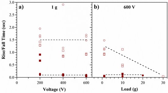 Membrane deflection in response to turning the voltage on and off. Error bars indicating the standard deviation of three runs at each voltage on the same device are smaller than the size of the data point marker. (a) Membrane deflection versus voltage under a 1 g load; (b) Load curve for the same devices at 600 V as the force on the membrane was increased. The dashed line is a linear curve fit to the average of the three devices.