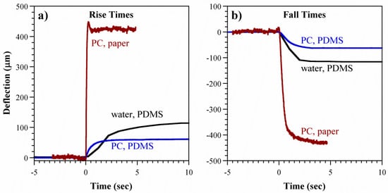 To gain insight into the mechanism for the fluid flow, devices (n = 2) were fabricated without the paper microchannel layer (Figure 4b). The membrane deflected in the same way and to the same extent as for the previous devices, regardless of the sign of the voltage (±5 kV), and again actuation occurred for both polarities.