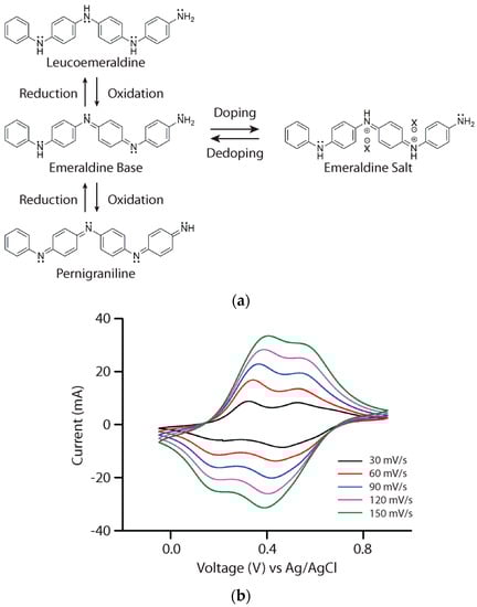 Polyaniline stands out among conducting polymers for its ease of doping/dedoping and tunable conductivity. Upon partial oxidation from its leucoemeraldine base (LEB) form or partial reduction from the pernigraniline base (PNG) to the emeraldine base (EB) and doping with strong acids, conducting polyaniline salts are formed. The general rule of thumb when applying polyaniline to supercapacitors and improving cycling stability is to limit applied potentials below 0.6 V versus Ag/AgCl to avoid over-oxidation [12,13]. Studies carried out on the effect of potential on polyaniline have shown that over-oxidation occurs with the generation of degradation products such as quinoneimine species which accompany a great decrease in charge retention [12,14,15].
