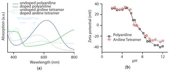 (a) UV–visible spectra of polyaniline and aniline tetramer demonstrating a color change from blue to green upon doping each in its emeraldine base state; (b) Zeta potential spectra of polyaniline and aniline tetramer exhibiting similar characteristics as a function of pH.
