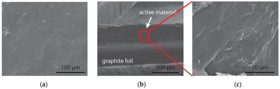 The active material containing aniline tetramer, graphene oxide flakes and polymer binders was deposited on graphite foil. Graphene oxide was added to provide aniline tetramer with a scaffold during repeated redox cycles, while the polymer binder was used to prevent the dissolution of the material. Graphene oxide was used instead of graphene in the fabrication of the electrodes because the relative hydrophilicity of graphene oxide allows for a more straightforward solution processing procedure and creates a more homogeneous solution of active material for drop-casting. The smooth and conductive film created can be seen in Figure 4a. A cross-sectional view of the electrode clearly shows the active material deposited on a graphite foil (Figure 4b). However, the expanded image does not show a typical layered graphene/graphene oxide structure [27] due to the relatively small amounts of graphene oxide added into the fabrication of the active material (Figure 4c).