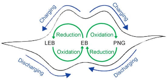 In a symmetric two-electrode setup, an electrodynamic equilibrium exists between the two identical electrodes, the applied potential should therefore be theoretically equally distributed over both electrodes. In a typical pseudocapacitor device setup, the material on the positive electrode is oxidized, while the negative electrode material is reduced during charging until the potential difference established between the two electrodes is equal to the set potential. Specifically in the fabricated devices of this study, transitions from the EB to the PNG (pernigraniline) state occur for one electrode during device charging, while the EB state is reduced to the LEB (leucoemeraldine) state for the other electrode. During device discharging, the PNG and LEB states are converted back to the EB state on the respective electrodes (Figure 5).