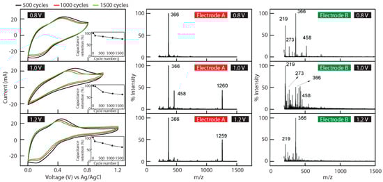 The potential windows used for the devices were chosen to investigate the stability of the aniline tetramer with increasing levels of charging past the respective redox peaks. Figure 6 shows the CV graphs and MALDI TOF spectra for both sides of the electrode of three different devices with potential windows of 0 to 0.8 V, 0 to 1.0 V, and 0 to 1.2 V. The mass spectra peak with an m/z value of 366 corresponds to the EB state of the protonated aniline tetramer. For ease of spectra interpretation, only the CV spectra collected at 500, 1000, and 1500 cycles for each device with different potential windows are shown. In each set of CV curves, the redox peak observed demonstrates the Faradaic processes occurring in the system. The observed current plateau past the redox peak signifies a double-layer charge storage mechanism and is found in each device. There is a gradual shift in the anodic redox peak towards less positive potentials accompanying a decrease in the current intensity with the increasing cycle number. This suggests diminishing Faradaic charge/discharge properties with the degradation of some redox-active aniline tetrameric material. After 1500 cycles, the device with a potential window of 0.8 V retains 75.2% of its initial capacitance, the 1.0 V device maintains 62.9%, while only 58.6% remains for the 1.2 V device. In all the mass spectra (Figure 6), the aniline tetramer mass peak is still observed with a high percent intensity. This can be attributed to the dissolution of the electrode material during the course of electrochemical studies which is observed directly after disassembling the supercapacitor device for MALDI TOF testing. With the loss of charge and diffusion-controlled charge transport upon material dissolution, much of the aniline tetramer may have been prevented from undergoing redox reactions. The relatively rapid deterioration of the device performance can also be attributed to the dissolution of the active material.
