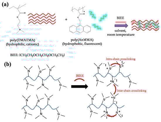 (a) Chemical structures of the linear poly(2-(dimethylamino)ethyl methacrylate) (pDMAEMA) and poly(9-anthrylmethyl methacrylate) (pAnMMA) homopolymers and of the 1,2-bis-(2-iodoethoxy)ethane (BIEE) crosslinking agent, and schematic of the one-step synthetic approach followed for the preparation of 3D luminescent semi-interpenetrating amphiphilic network (APN); (b) crosslinking reaction scheme presenting both, intra- and interchain crosslinking pathways that may occur between BIEE and –N(Me)3 pendant moieties of the poly(DMAEMA) linear chains.