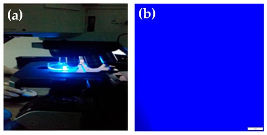 (a) Photograph of the BIEE/pDMAEMA/pAnMMA semi-interpenetrating network (semi-IPN) polymer network when exposed to UV irradiation, displaying strong blue emission; (b) corresponding fluorescence microscopy image. The scale bar in Figure 2b is 100 μm.