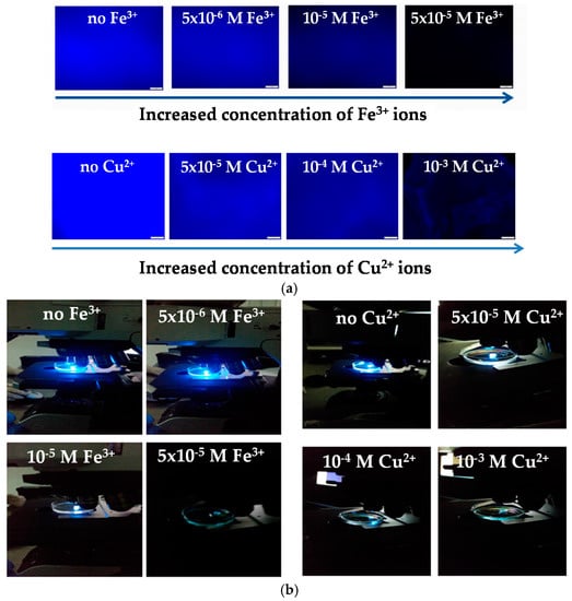 Figure 4a provides the fluorescence images corresponding to the BIEE/pDMAEMA/pAnMMA methanol-swollen network immersed in pure methanol (control samples) and methanol solutions containing different Fe3+ and Cu2+ metal ion concentrations. From the obtained fluorescence images, it can be clearly observed that the fluorescence intensity of the network is effectively quenched in the presence of both Fe3+ and Cu2+ metal ions, whereas quenching is more pronounced upon increasing the metal ion concentration as expected. During the analysis by means of fluorescence microscopy, photographs of the networks immersed in metal ion solutions of various concentrations were also taken in real time. As seen in Figure 4b, fluorescence quenching can be easily visualized, since upon immersion of the fluorescent network in the metal ion solutions its fluorescence efficiency reduces significantly.