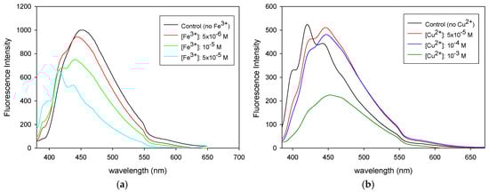 These materials were further evaluated in the chemosensing of Fe3+ and Cu2+ transition metal ions. The former is a key element in biological and environmental systems, playing an essential role in oxygen uptake and metabolism and electron transfer processes []. Cu2+ ions, which are known to exhibit high affinity for N– and O–containing ligands, significantly contribute to the metal environmental pollution owing to their widespread industrial use. Even though the toxicity of Cu2+ ions is considerably lower compared to other heavy metal ions, very low Cu2+ concentrations are highly toxic to certain microorganisms [].