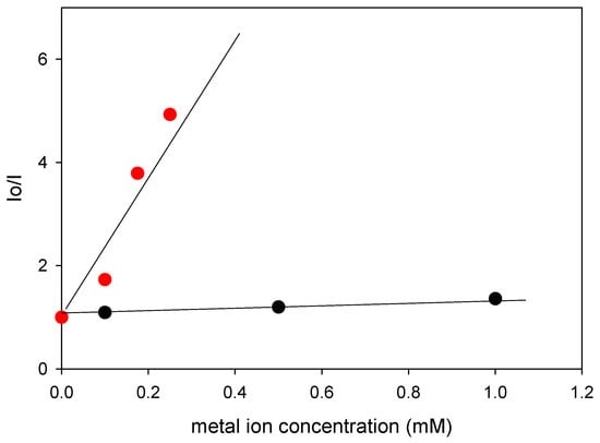 Stern–Volmer quenching plots of 9-anthracenemethanol in the presence of Fe3+ (red circles) and Cu2+ (black circles).