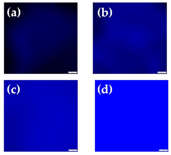 Fluorescence images analyzed using the CellSens software. Images (a,b) correspond to the Cu2+-loaded system equilibrated in 5 × 10−3 M Cu2+ methanol solution prior to and after immersion in the ethylenediaminetetraacetic acid (EDTA) aqueous solution, respectively. Images (c,d) correspond to the Cu2+-loaded system equilibrated in 10−3 M Cu2+ methanol solution prior to and after immersion in the EDTA aqueous solution, respectively. The scale bar in Figure 7 is 100 μm.