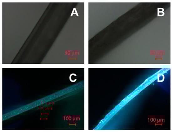 The images of the cuts of modified PLA films obtained by optical microscopy: (A,B) PLA-PAAm and PLA-Alg in transmitted light; (C,D) PLA-PAAm and PLA-Alg in reflected light.