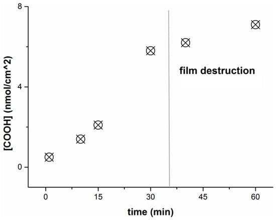 Firstly, the PLA films were modified using controlled saponification with 0.1 M NaOH in order to generate the carboxylic groups. The concentration of the generated groups was evaluated via the coupling of low molecular weight glycine. The effect of film treatment with NaOH, namely, the dependence of the amount of introduced carboxyls on the time of treatment, was studied (Figure 4). Obviously, the quantity of COOH-groups increases with increasing reaction time. It should be noted that the films stayed stable during 30 min of treatment. Longer treatment with sodium hydroxide led to the destruction of a film into the separated pieces. A 30 min reaction resulted in the maximum amount of carboxylic groups with permanent stability of the film.