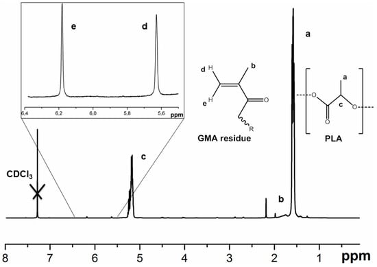 1H NMR of the PLA film modified with glycidyl methacrylate GMA and dissolved in CDCl3. Both signals of PLA (a,c) and GMA residue (b,d,e) can be observed.