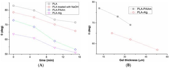 The contact angles of the water drops on the surface of the initial and modified films were studied to evaluate the effect of modification on the wettability of films. The contact angles of water on the surface of PLA films were plotted as a function of time (Figure 6A) and gel layer thickness (Figure 6B). It was found that the value of the contact angle decreased with the time for all studied films. The contact angles for the PLA film treated with 0.1 M NaOH was lower than that measured for the initial film. The films covered with gel on the surface exhibited a higher extent of a contact angle decreasing with time in comparison with the non-modified PLA layers. The increasing thickness of the gel layer invariably led to wider drop spreading. The dependences obtained can be definitely explained by swelling of the surface gel layer.