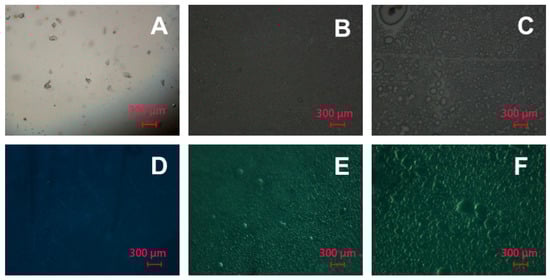 The images of the dried initial and modified PLA surfaces obtained by optical microscopy: (A–C) PLA, PLA-PAAm, and PLA-Alg in transmitted light, respectively; (D–F) PLA, PLA-PAAm, and PLA-Alg in reflected light, respectively.