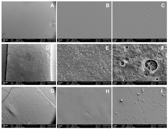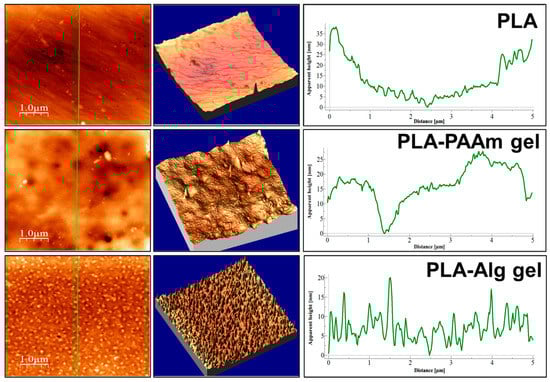 The data obtained by optical microscopy showed that the modification of the surface of PLA films (Figure 7A,D) both by PAAm (Figure 7B,E) and Alg (Figure 7C,F) gels changed their morphology; namely, the surface became more grainy. This can be observed both in reflected (Figure 7B,C) and transmitted light (Figure 7E,F). This observation allows the conclusion that on a micron scale the gels possess grainy structure. The size of the grains appears to be greater in the case of Alg gels. The average grain diameter for the Alg gel was 32 µm versus 14 µm for the PAAm gel.