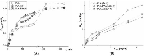 This supposition is likely to be true if the BSA adsorption isotherms are analyzed (Figure 10B). To build the isotherms, protein concentration in a supernatant was measured after 24 h, e.g., after the time sufficient for the system to reach equilibrium. The initial PLA film exhibits the layer-by-layer adsorption behavior. At the same time, PLA-PAAm and PLA-Alg modified films possessed lower capacities towards the chosen protein, but no equilibrium plateau was revealed. The isotherm curves plotted for the films modified with a hydrogel layer were nearly linear. Thus, the adsorption process does no reach an equilibrium plateau, which corresponds to the maximum surface capacity, with the concentrations under study. The obtained curves could not be described by the Langmuir adsorption isotherm equation. This type of protein interaction with the surface is likely to be caused by the penetration of a protein inside the pores of a gel with a very high inner surface area. Thus, it can be concluded that the modification of PLA films with hydrogels changes their interaction with albumins, which is known to greatly affect the cell-material interaction. No albumin layer on the surface is formed on the modified films due to its absorption by the hydrogel.