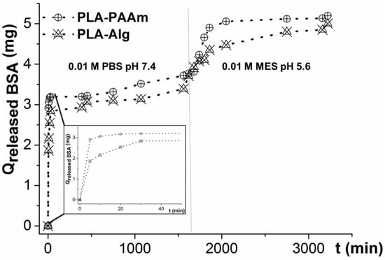 The release of BSA was studied by immersing the modified films into 0.01 M PBS, pH 7.4 (Figure 11). During the first 20 min, the release was very fast, and was caused by the protein desorption from outer surface of gel. Then the release became slower since the diffusion of a protein in the gel pores needed a much longer time. The release at pH 7.4 finished after approximately one day of experimentation. From our previous studies, it was known that no further release of a protein occurred at such pH. To release the rest of the protein, the buffer was changed from PBS (pH 7.4) to MES (pH 5.6) (Figure 11), in order to change the BSA size and its interaction with the gel. Near total amounts of the protein were released from both PAAm and Alg gels at such conditions. The release from the Alg gel with MES buffer was slightly slower than that observed for PAAm. This fact can be related to the Alg gel compaction leading to the slower BSA diffusion inside the gel. It can be concluded that the release at acidic conditions is generally governed not by gel swelling, but by the change of the protein properties and its interaction with the gel.
