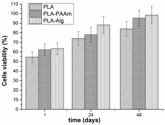 To test the possibility of application of the hydrogel-coated films in tissue engineering, the cell viability on the surface of PLA-PAAm and PLA-Alg was evaluated. The HELF cell line was used for this purpose. The cells were seeded onto the film surface and their viability was determined colorimetrically after 1 and 24 h using a MTT assay. One can observe (Figure 12) that the cell viability on the films with hydrogel layers was higher than that found for the initial PLA film. The PLA-Alg showed maximum cell viability within 24 and 48 h after fibroblast seeding. It seems that this type of hydrogel layer on the surface of PLA-based film is the most favourable for cells attachment and growth. This is in good accordance with previously published results on cell cultivation inside the alginate capsules []. The higher cell viability in the case of PLA-Alg could also be the result of the larger surface area in this sample in comparison with the other investigated films (see Table 2).